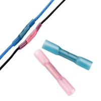 Einfache Möglichkeit zwei Kabel dauerhaft und sicher mit einander zu verbinden: Kabel abisolieren, Kabel in Lötverbinder einführen und mit Heißluftgebläse erhitzen.