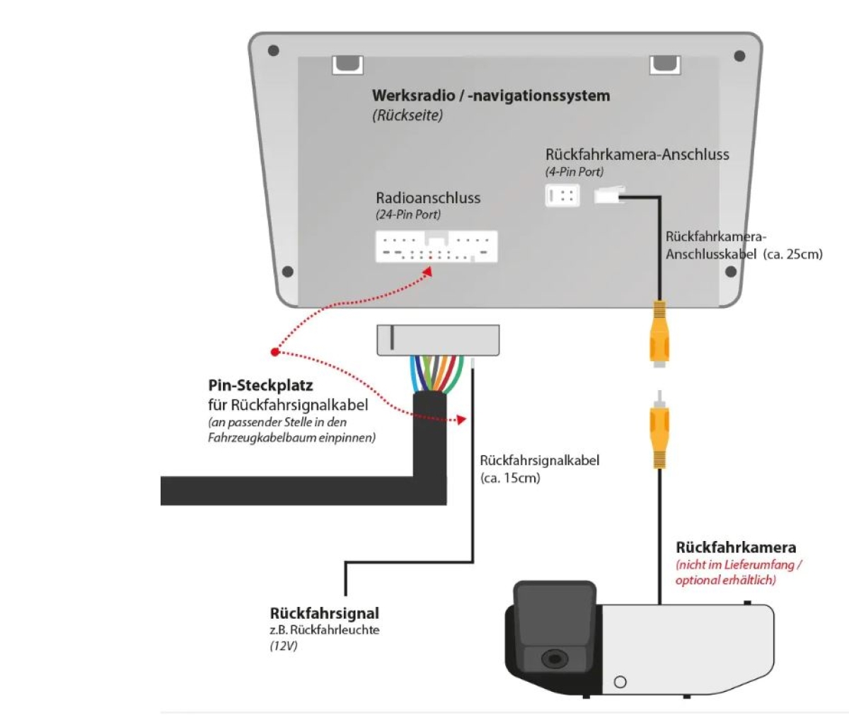 Mit dem 2. Kabel wird das Schaltsignal der Rückfahrleuchte in das Werksnavigationssystem eingespeist. Dazu wird das Kabel in den vorhandenen Fahrzeugkabelbaum eingepinnt.