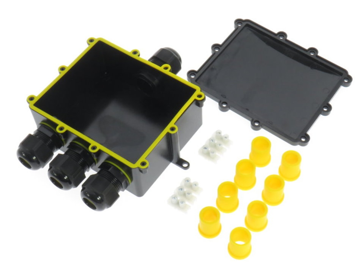 - Die Ein- und Ausgänge haben hochwertige Verschraubungen mit gelben Gummidichtungen für Kabeldurchmesser 4-8 mm, 8-12 mm und 10-14 mm