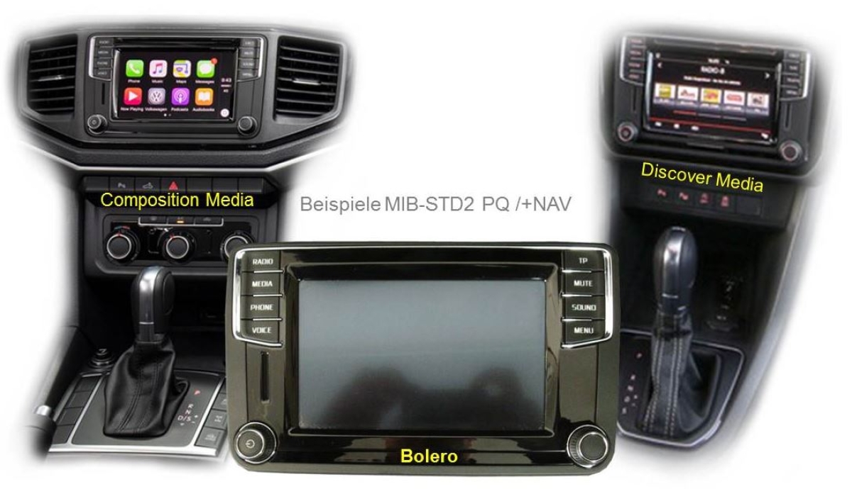 | Volkswagen | Amarok (2H) 09/2017-05/2020, Beetle (5C) ab Modelljahr 2015-, Caddy4 (SA) Modelljahr 2016-2020, Scirocco3 (13) ab Modelljahr 2016, Sharan (7N) ab Modelljahr 2016, Transporter T6 (SG) 07/2015-10/2019 | MIB STD2 PQ/+NAV - Composition Media/Discover Media All-in-One 2DIN Head-Unit mit 1x SD-Slot vertikal links oder 2x SD-Slots vertikal links+rechts und CD-Laufwerk oberhalb des 6,33-Zoll-Monitors |